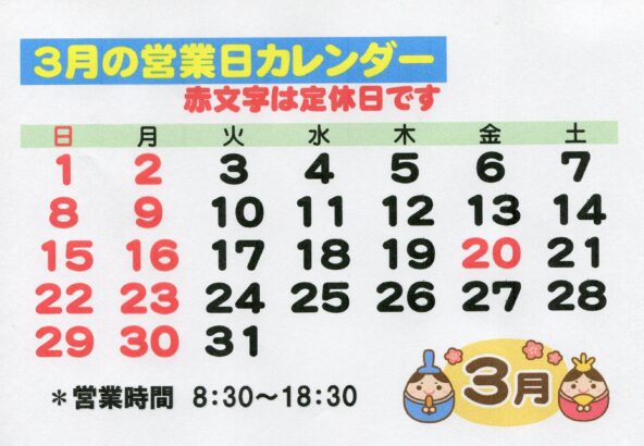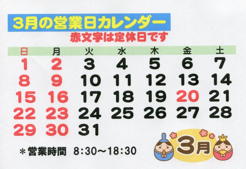 こんにちは。萬平商店です。3月の営業についてのお知らせです。 ・営業時間は、8:30~18:30です。・カレンダーの赤文字は、定休日です。・萬平商店では、レジ袋の大小に関わらず、1枚につき3円の有料になります。