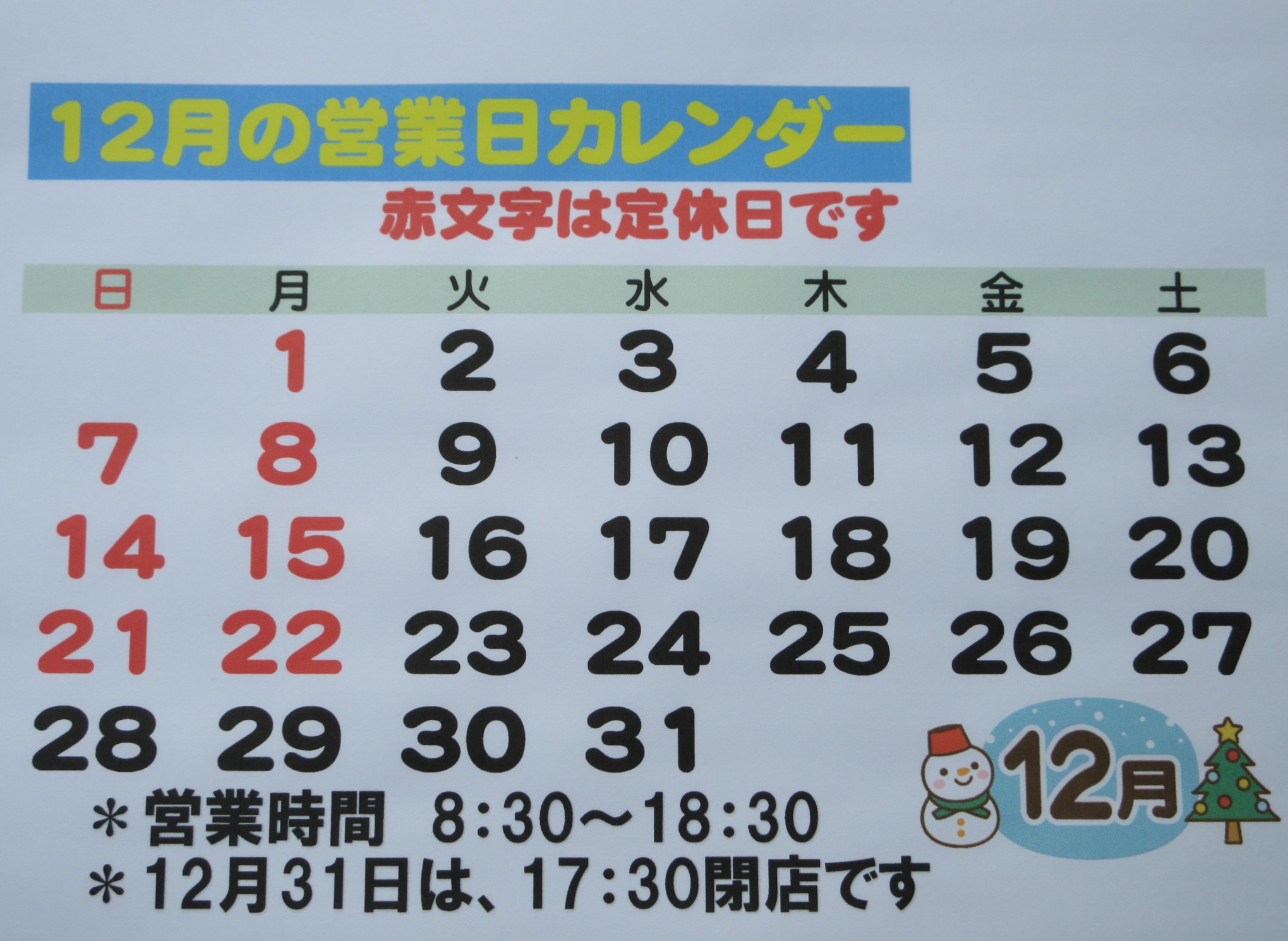 12月の営業についてのお知らせです。